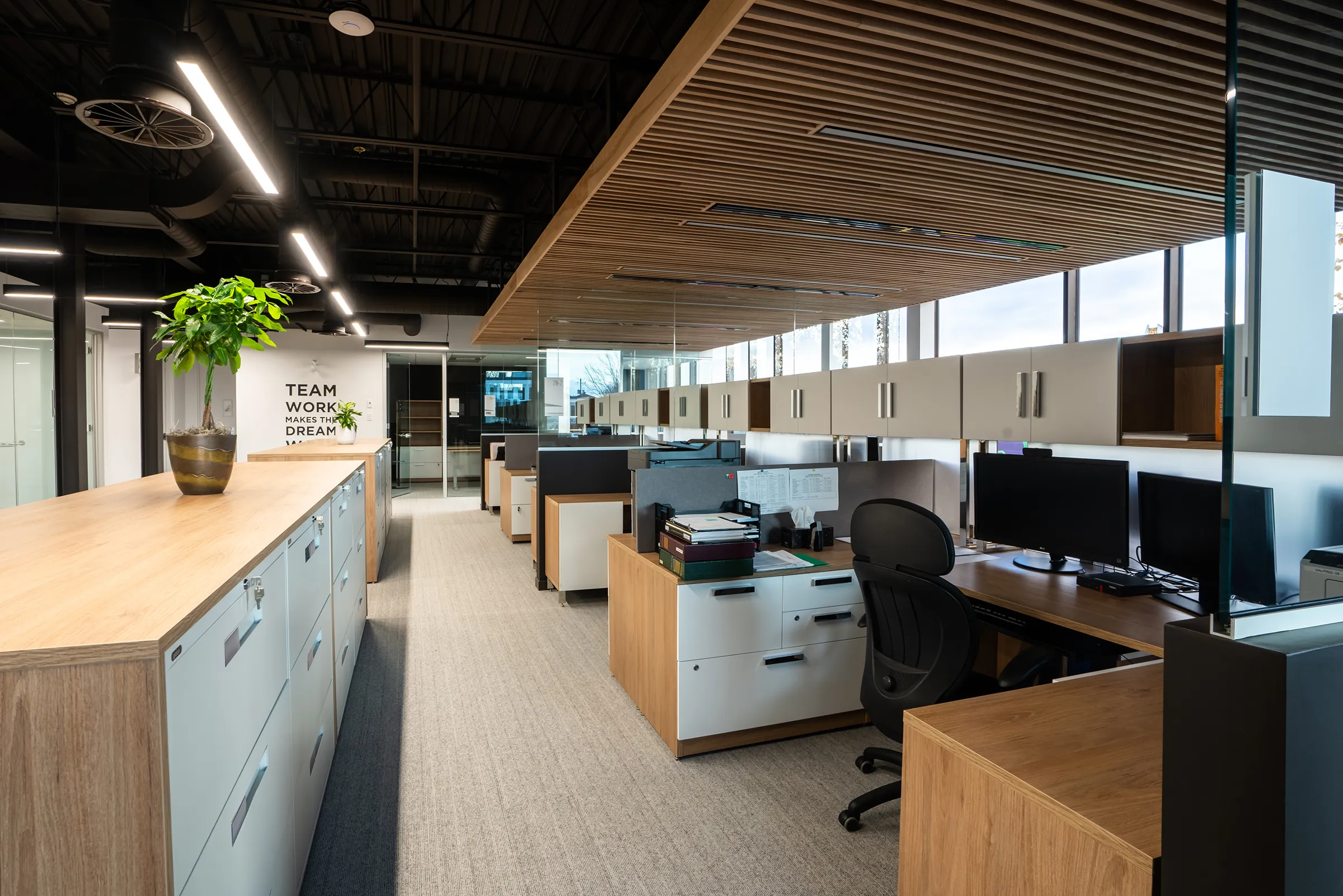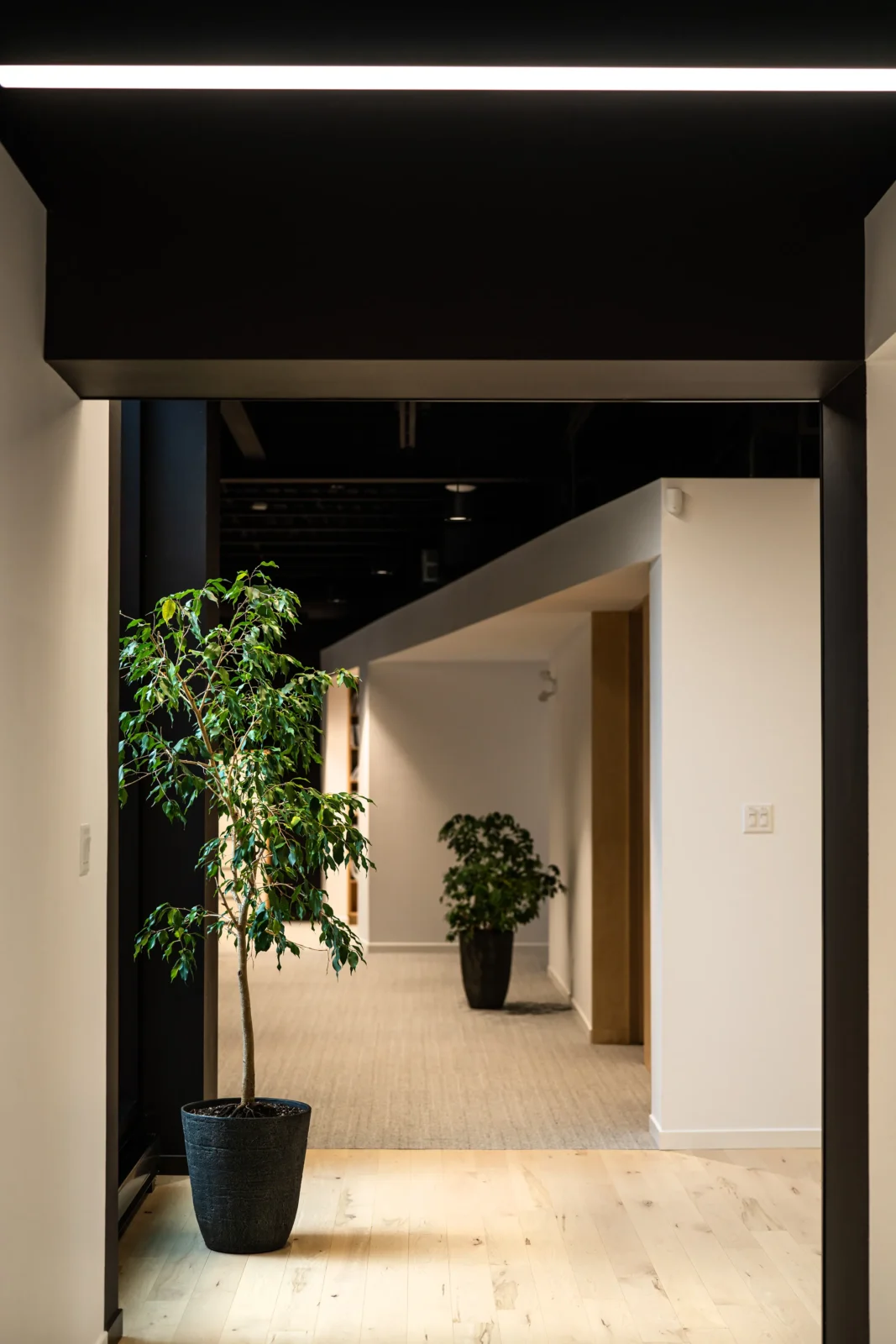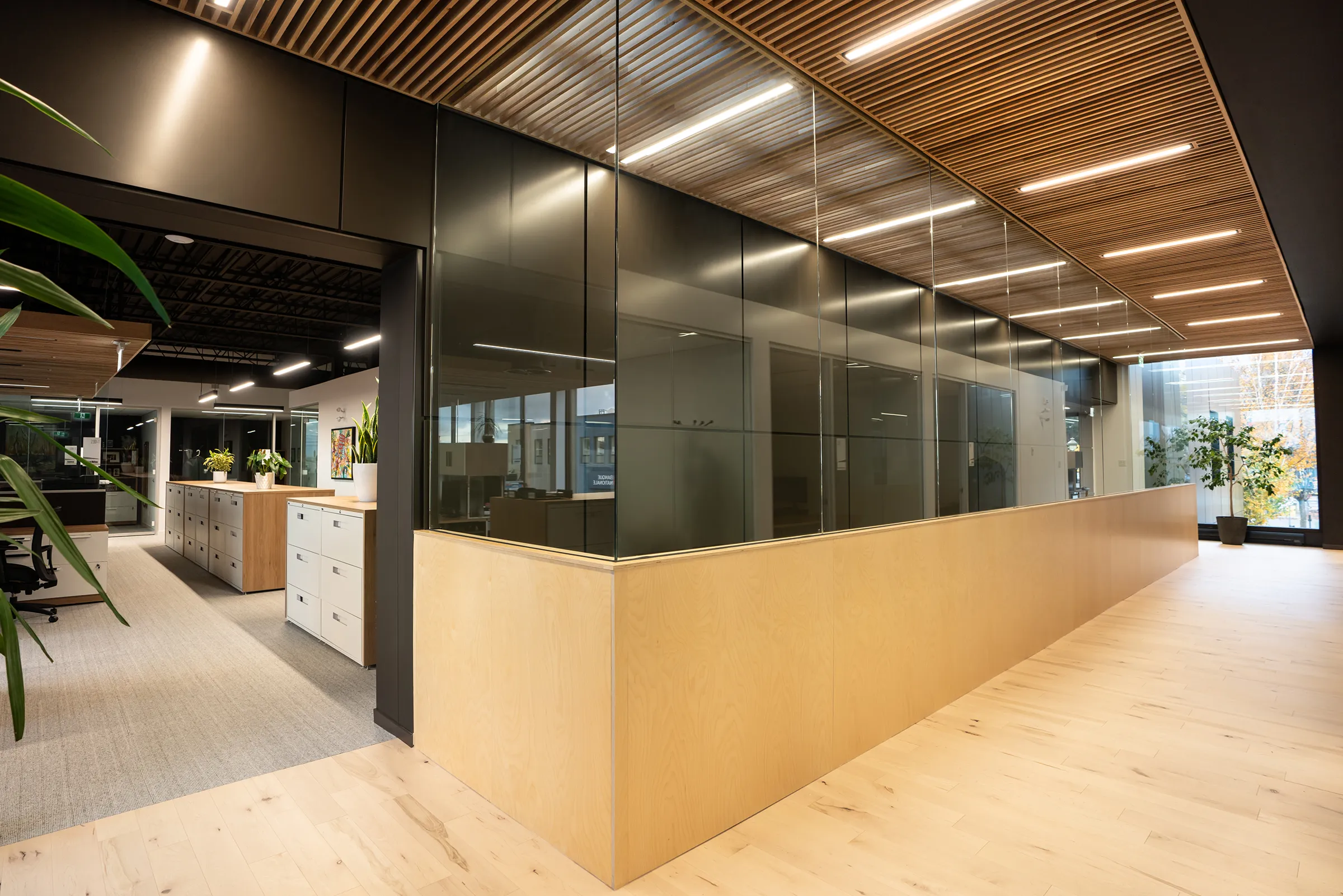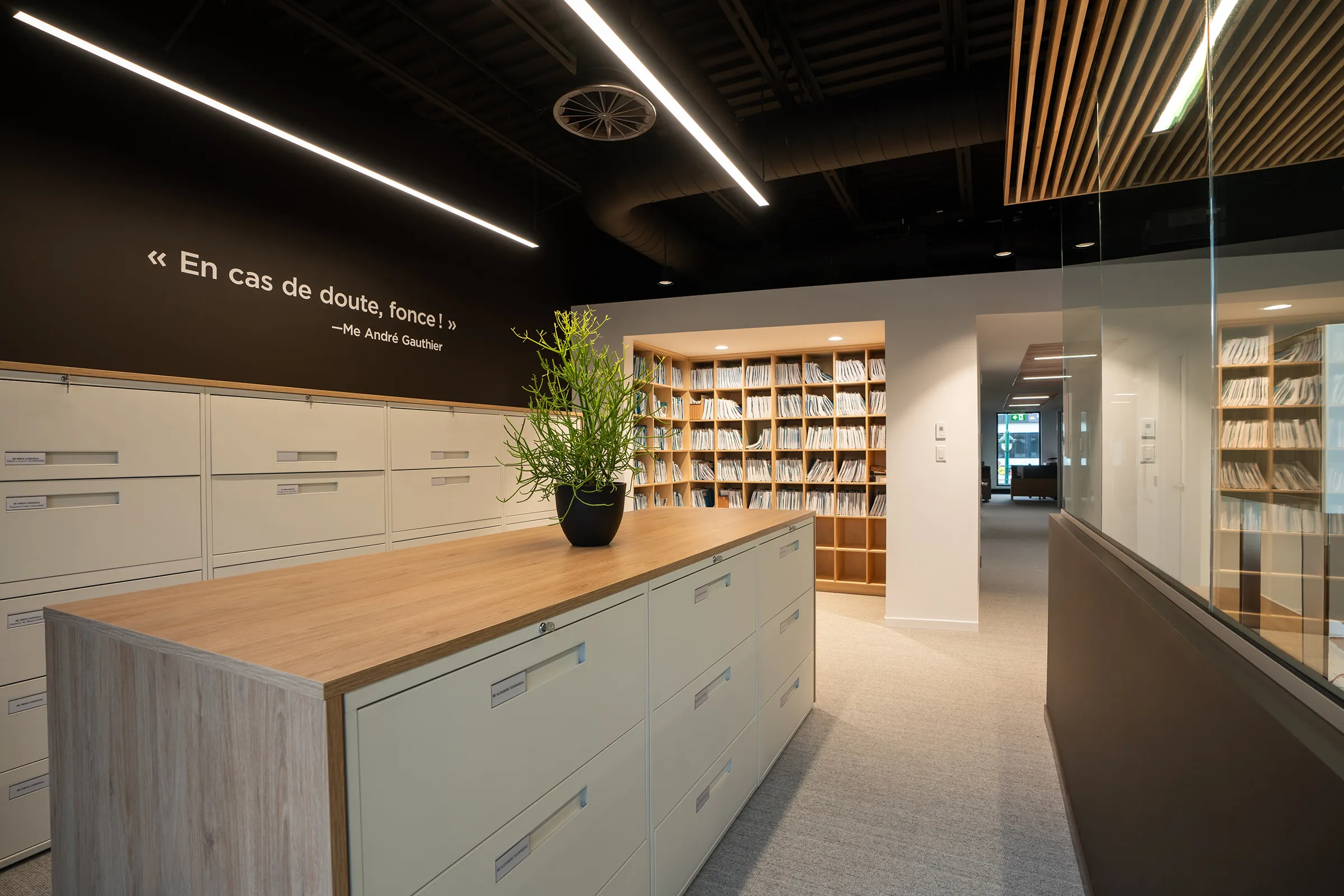 Une enveloppe aux formes géométriques qui dynamise la façade urbaine du centre-ville de Val-d’Or, tout en demeurant sobre et chic. Accentuant l’ouverture des espaces et bonifiant la luminosité et la fluidité, les cloisons de verre intérieures constituent l’un des éléments clés de ces aménagements. Le bois et certains tons contrastants participent, pour leur part, à créer un environnement professionnel à la fois chaleureux et rassurant.