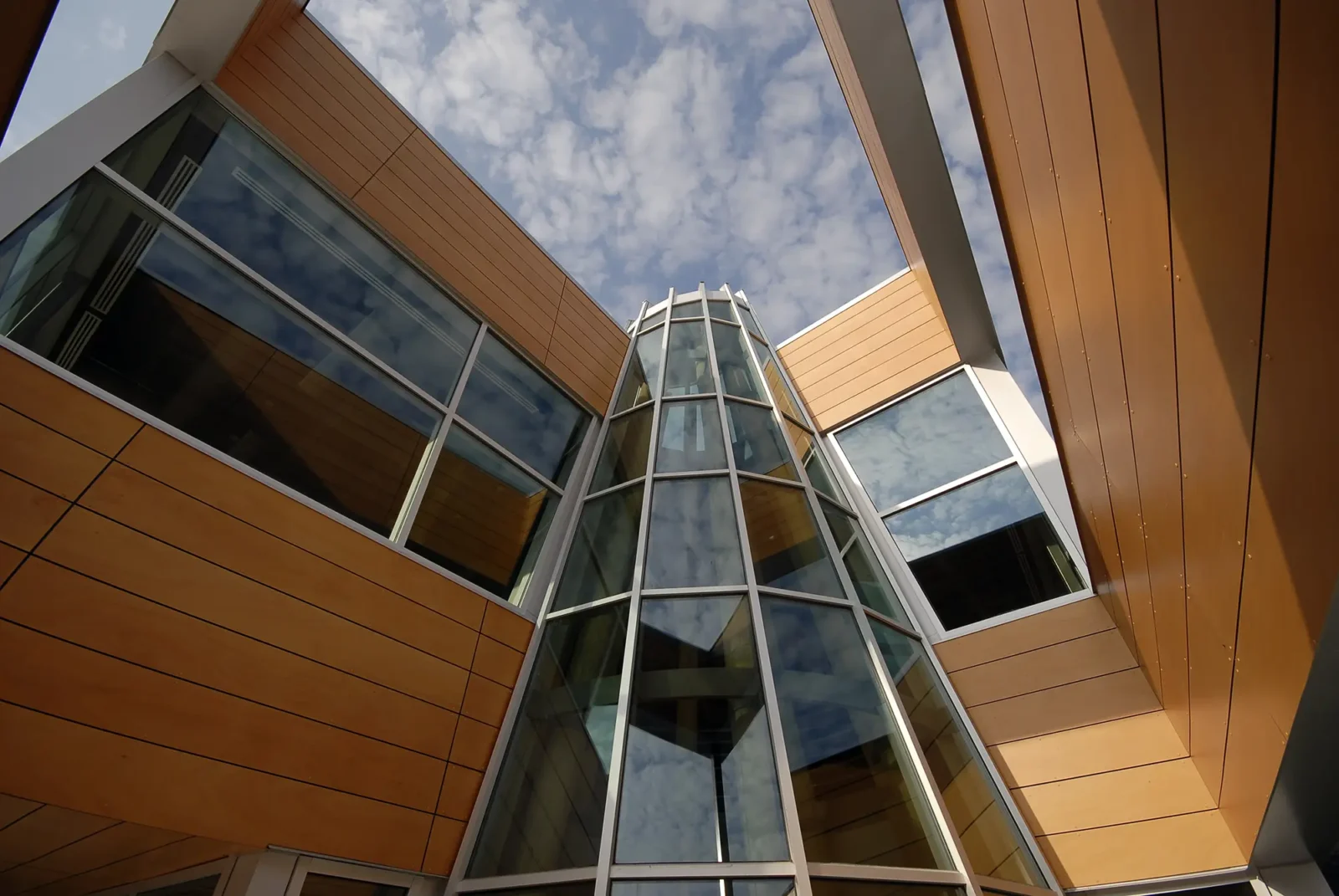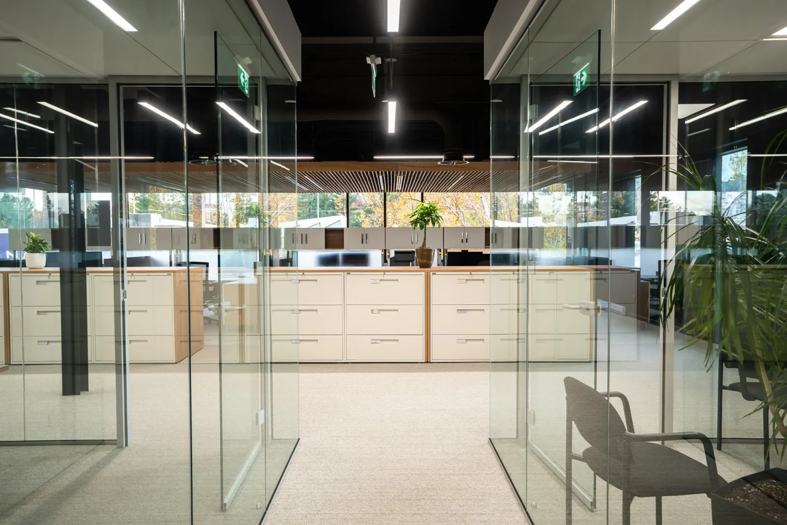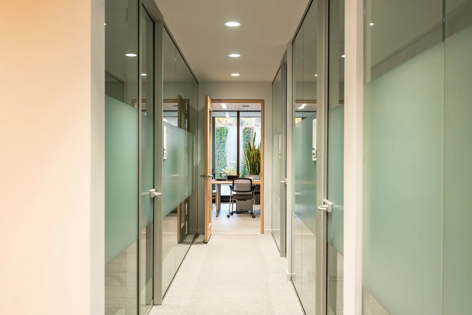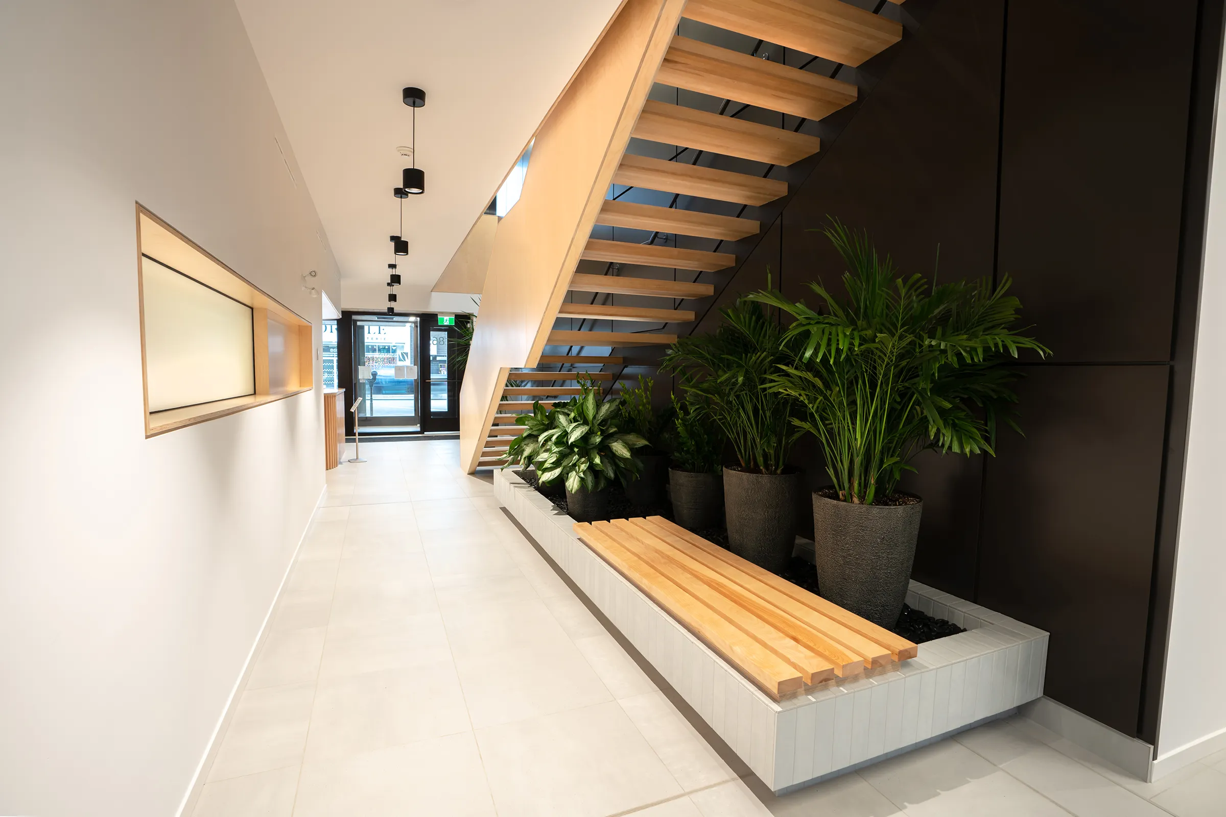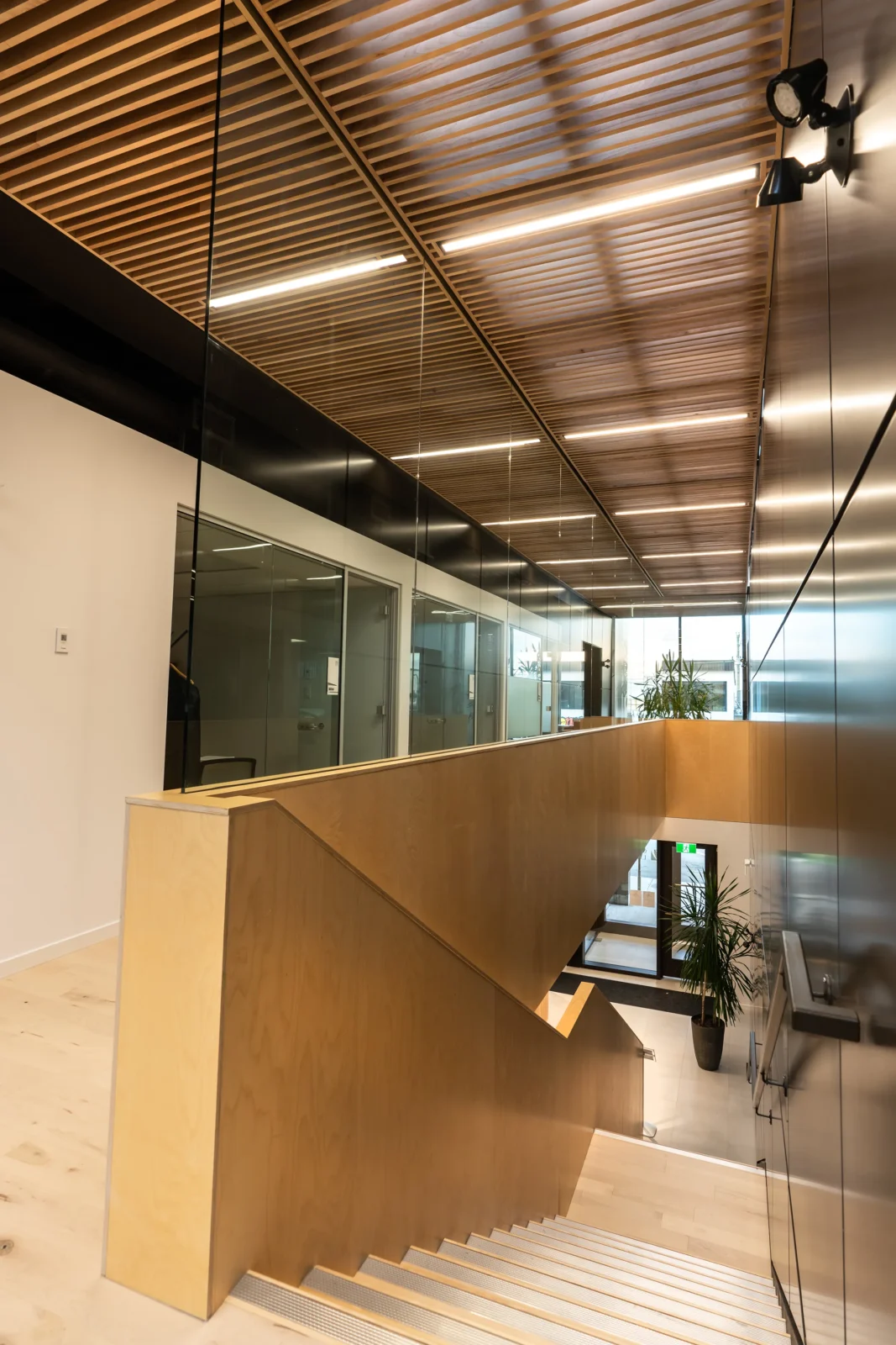 Une enveloppe aux formes géométriques qui dynamise la façade urbaine du centre-ville de Val-d’Or, tout en demeurant sobre et chic. Accentuant l’ouverture des espaces et bonifiant la luminosité et la fluidité, les cloisons de verre intérieures constituent l’un des éléments clés de ces aménagements. Le bois et certains tons contrastants participent, pour leur part, à créer un environnement professionnel à la fois chaleureux et rassurant.