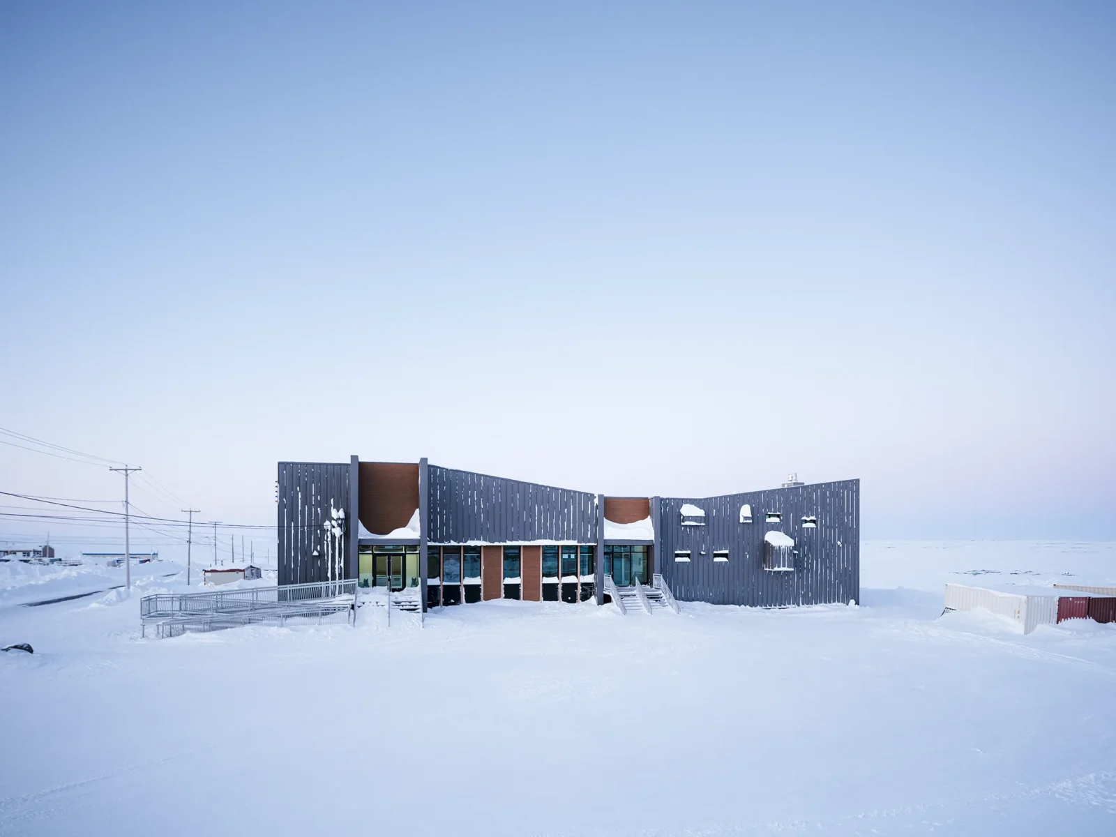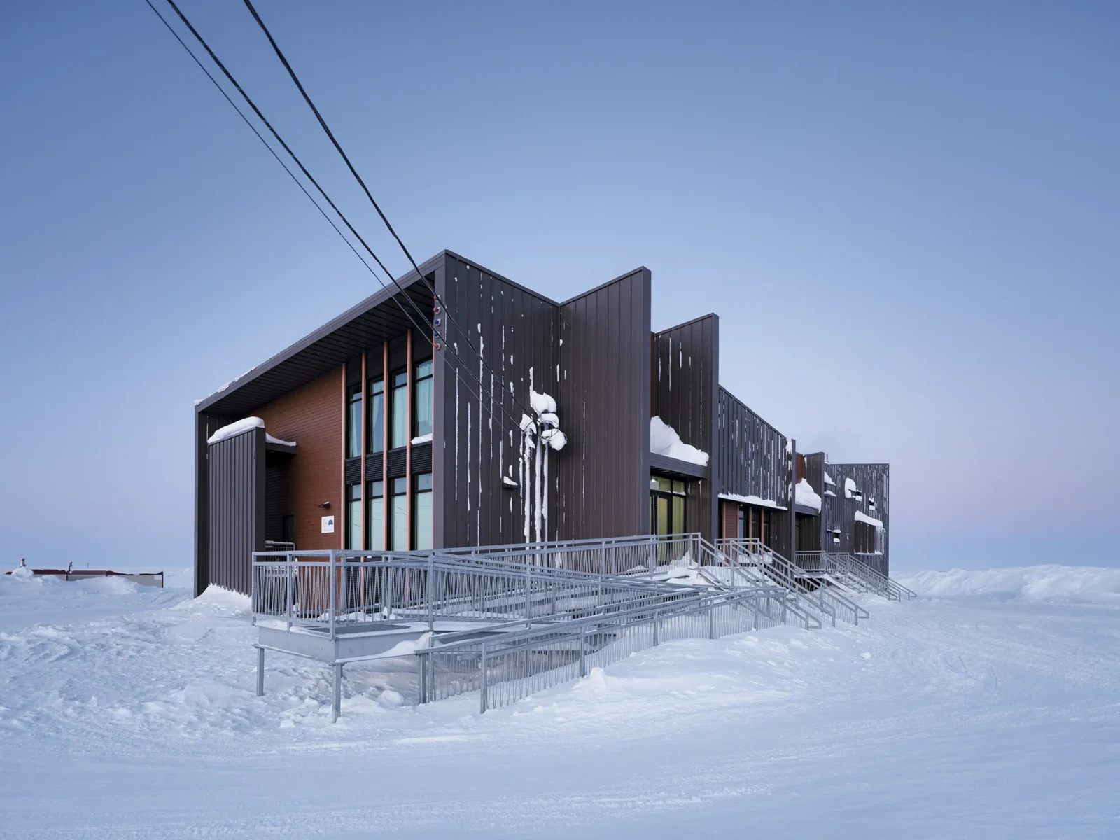 Ce nouveau Centre de congrès multifonctionnel abrite des salles de conférence, un restaurant pouvant desservir plus de 200 personnes. Le secteur administratif situé à l’étage vient compléter le programme de ce projet surplombant la communauté de Puvirnituq. Une structure de bois lamellé collé vient recevoir l’enveloppe du bâtiment, telle une peau, favorisant l’expression de la verticalité et la hauteur des espaces intérieurs.