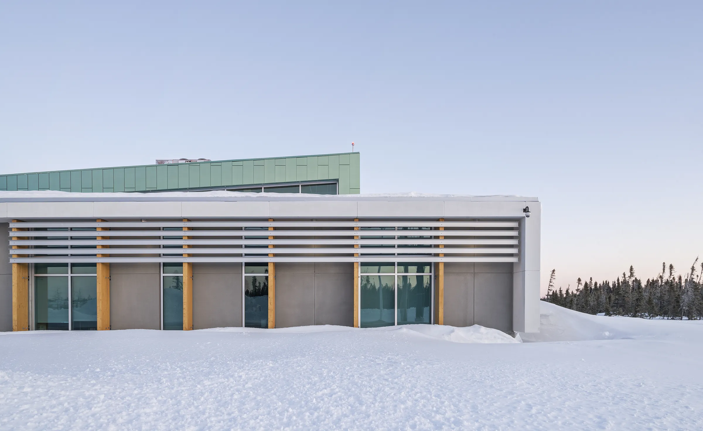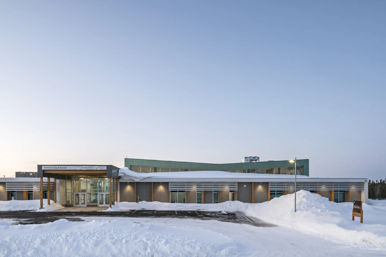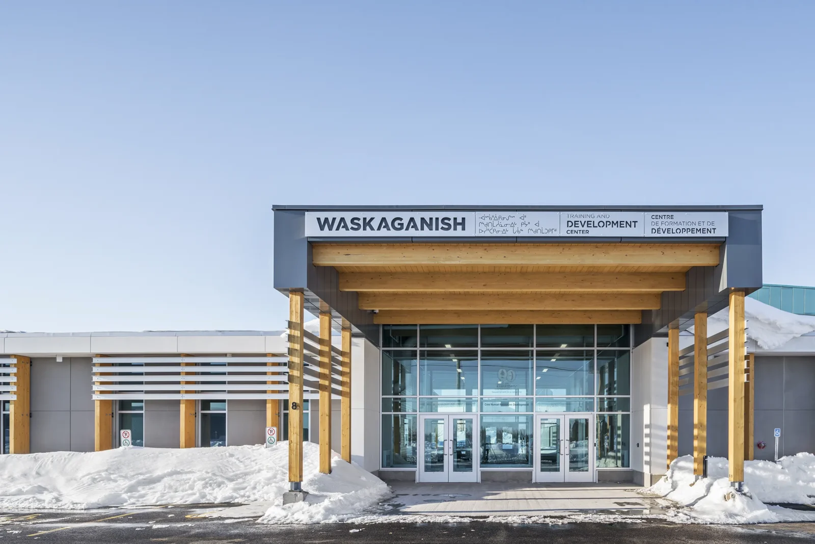 Le centre de formation de Wemindji a été réalisé en 2015 et celui de Waskaganish en 2017. Chaque bâtiment comprend deux différents volumes. La finesse linéaire de la façade composée de panneaux de béton préfabriqué et de brise-soleils rectilignes accentue l’horizontalité sur toute la longueur de l’édifice. Cette peau massive extérieure abrite le secteur administratif et les classes théoriques.