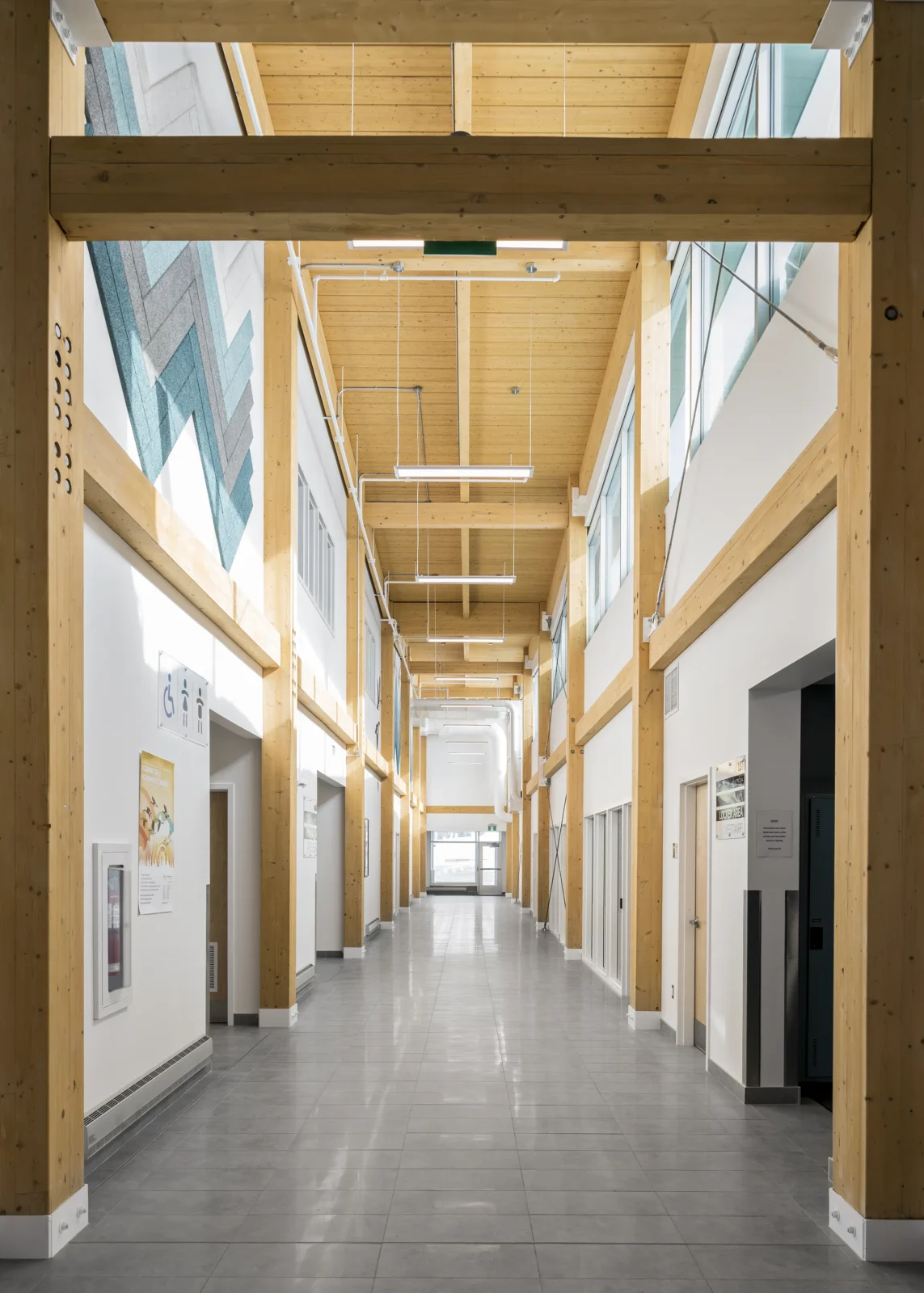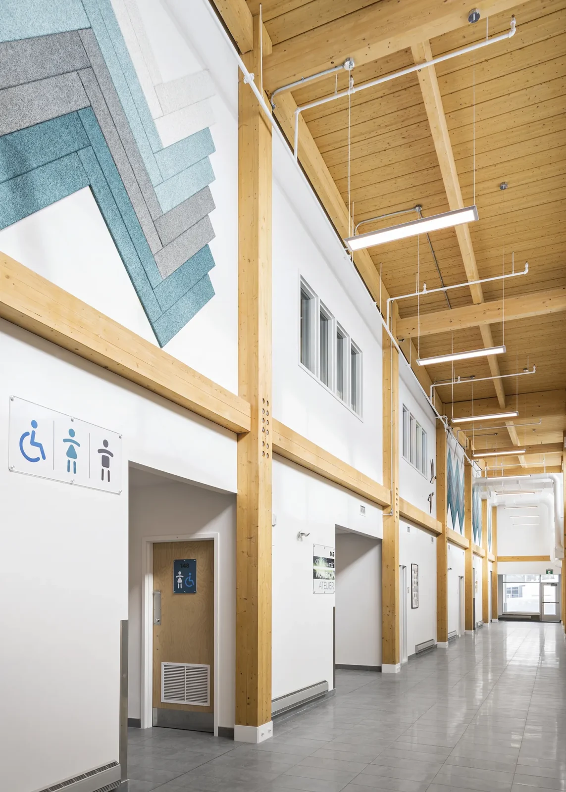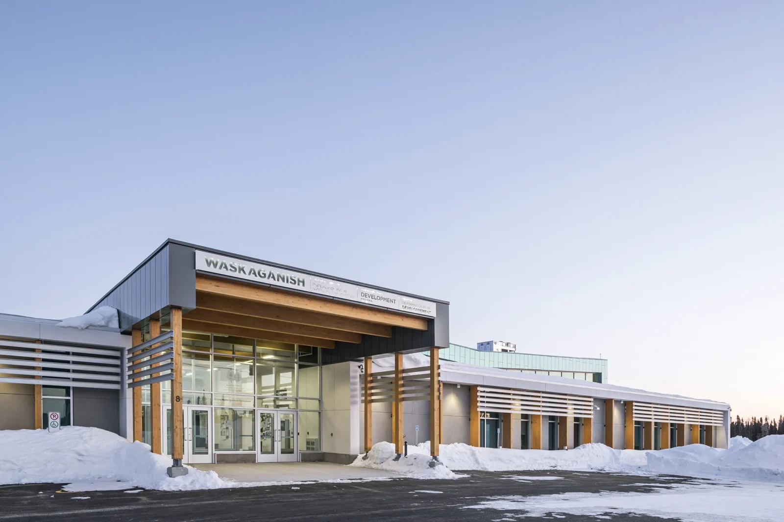 Le centre de formation de Wemindji a été réalisé en 2015 et celui de Waskaganish en 2017. Chaque bâtiment comprend deux différents volumes. La finesse linéaire de la façade composée de panneaux de béton préfabriqué et de brise-soleils rectilignes accentue l’horizontalité sur toute la longueur de l’édifice. Cette peau massive extérieure abrite le secteur administratif et les classes théoriques.