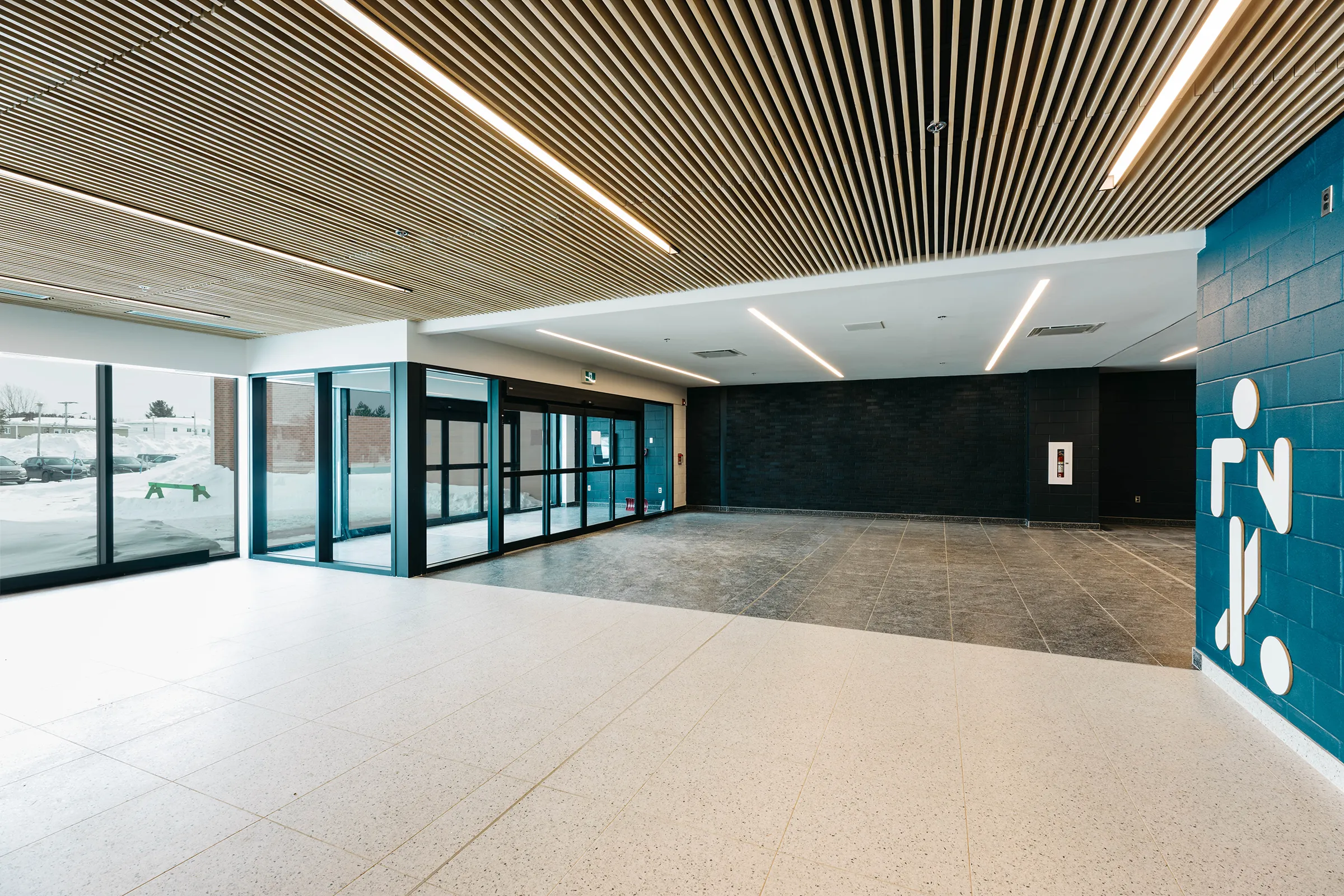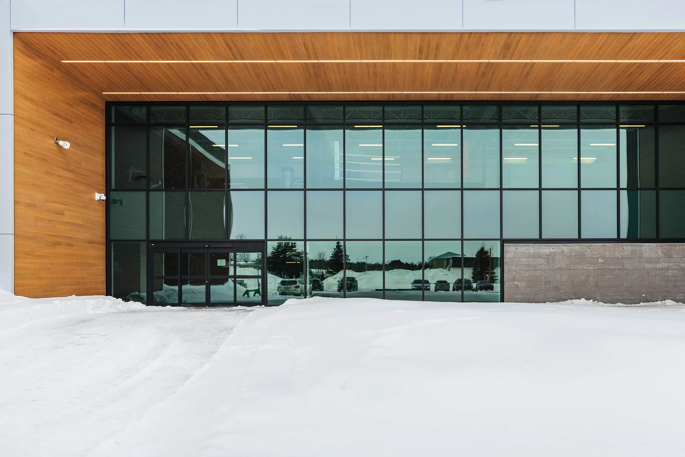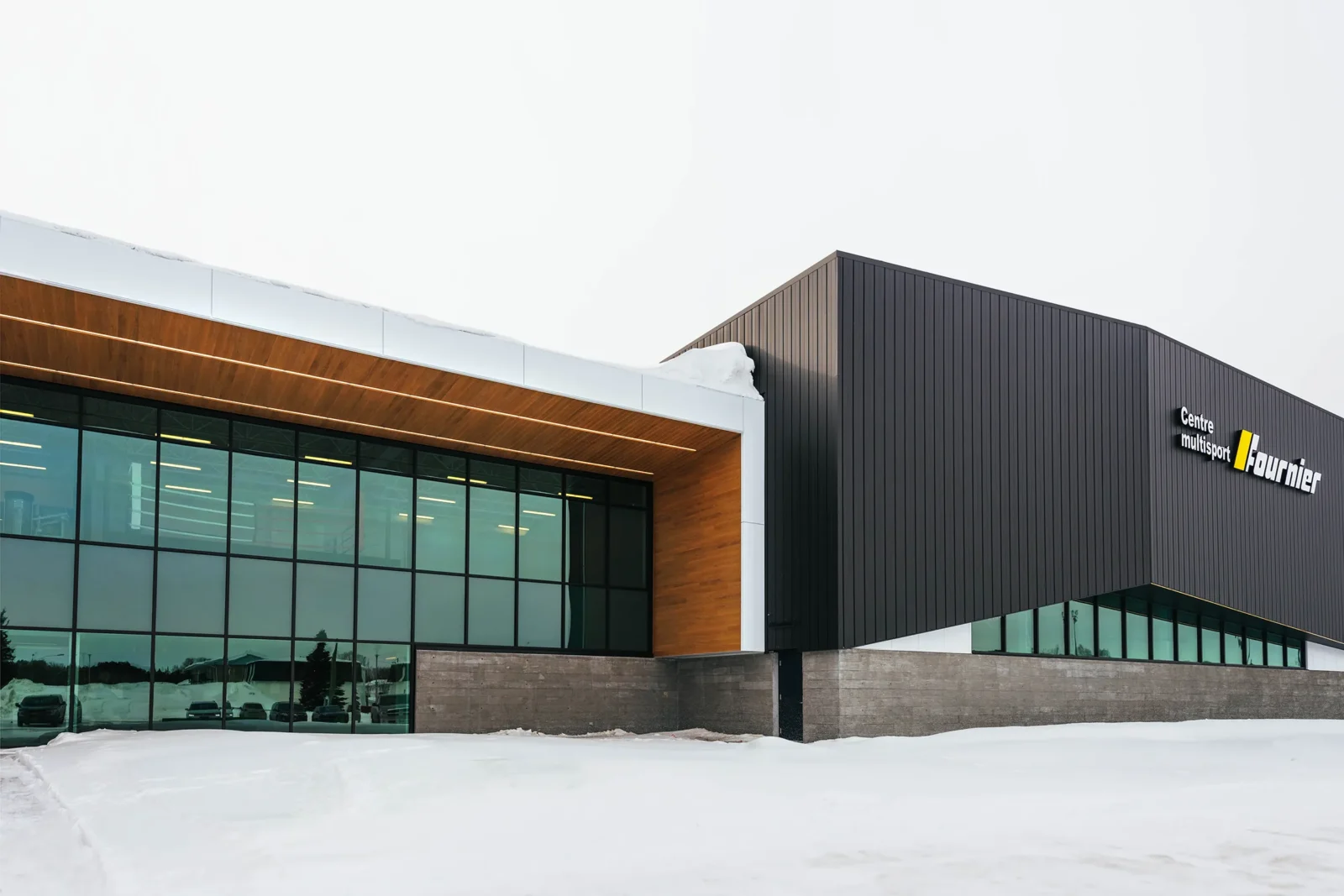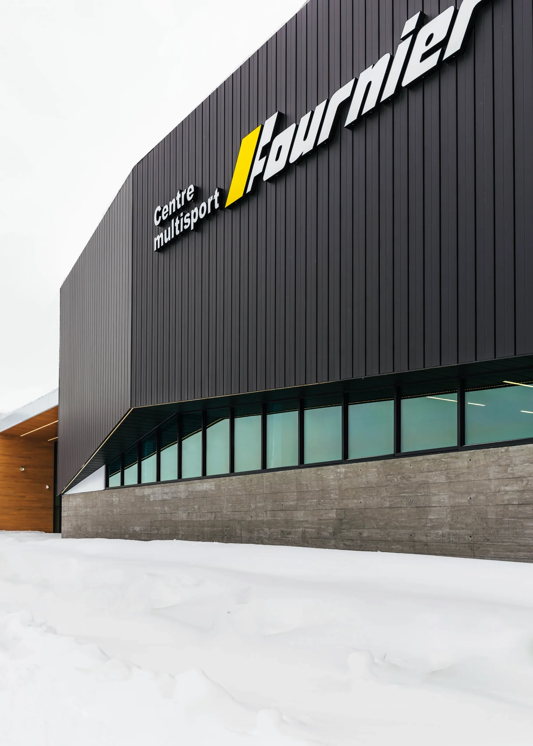 Le Centre multisport Fournier est greffé à la Polyvalente Le Carrefour de Val-d’Or. Le langage architectural du nouveau complexe se veut contemporain, tout en s’harmonisant à l’édifice existant par sa matérialité et ses couleurs. Le concept architectural se présente comme une juxtaposition de 2 blocs monolithiques, dont le plus imposant abrite les plateaux sportifs.