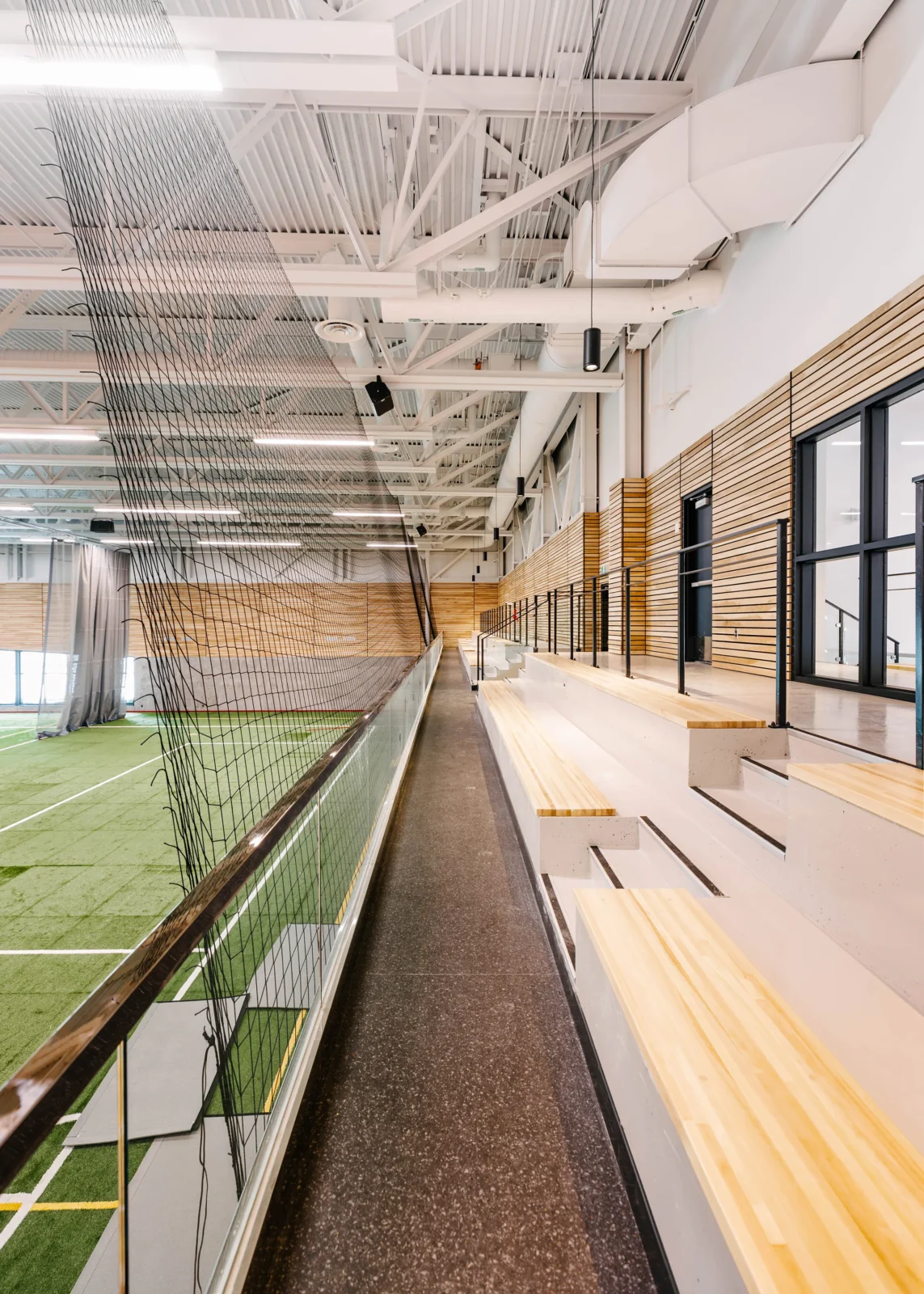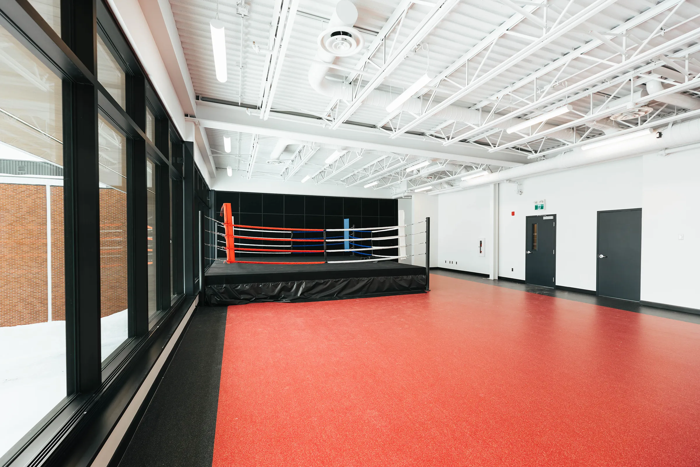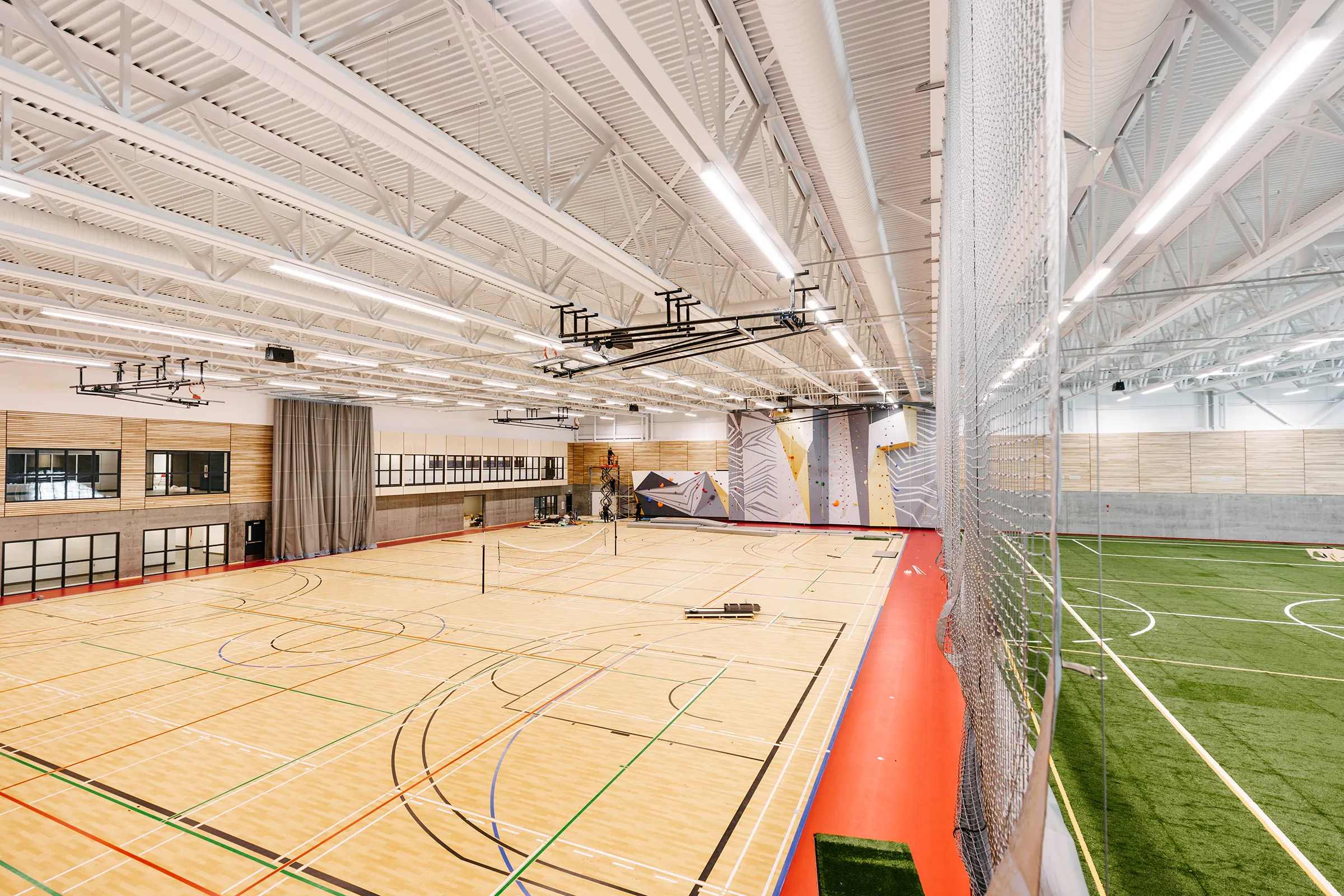 Ce bloc est traité de manière sobre et uniforme tout en présentant une façade latérale dynamisée par une percée vitrée dans l’enveloppe. Le second volume comprenant la palestre, présente un langage architectural plus défini en façade principale. La lumière naturelle pénètre de façon contrôlée à l’intérieur des plateaux.