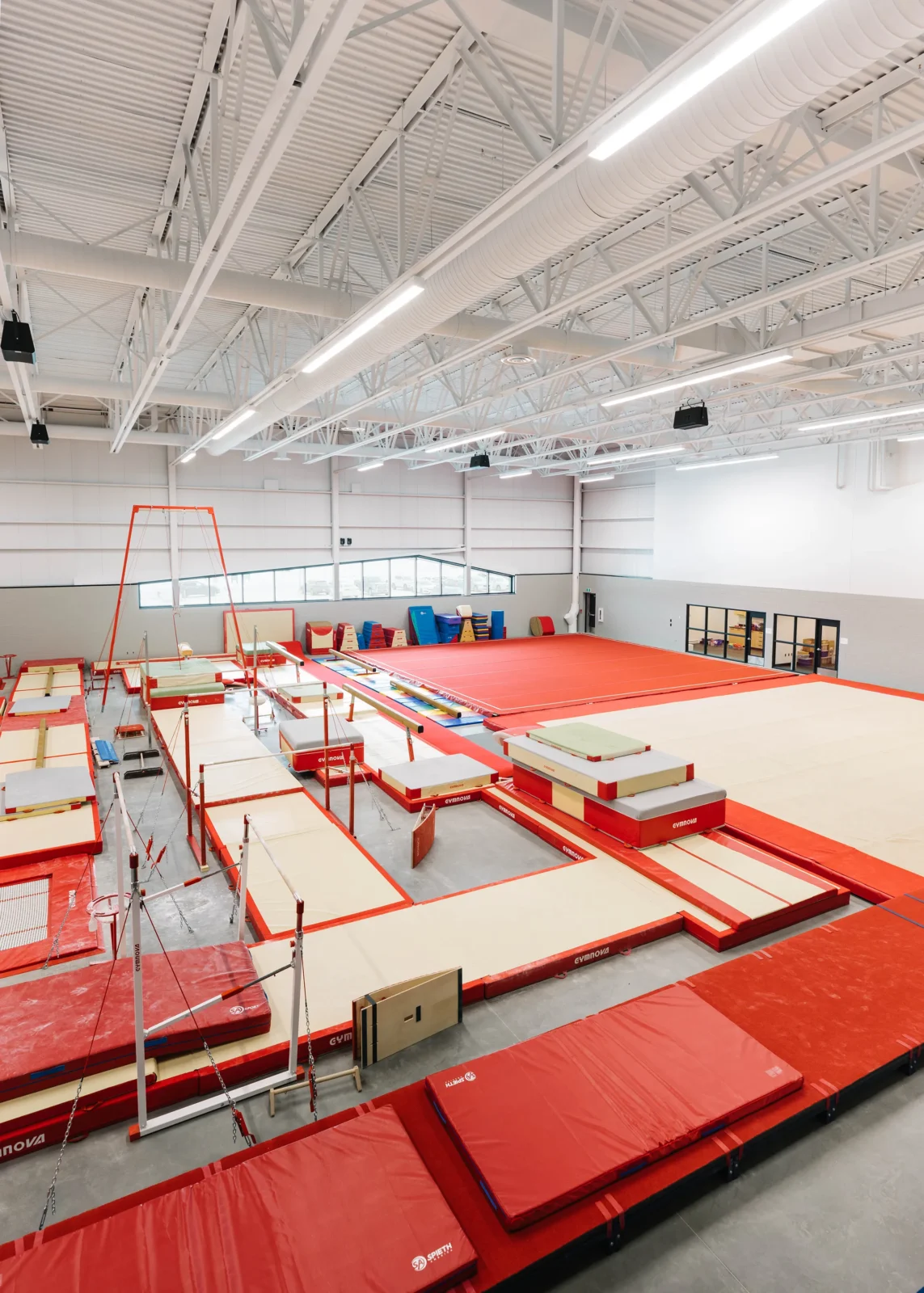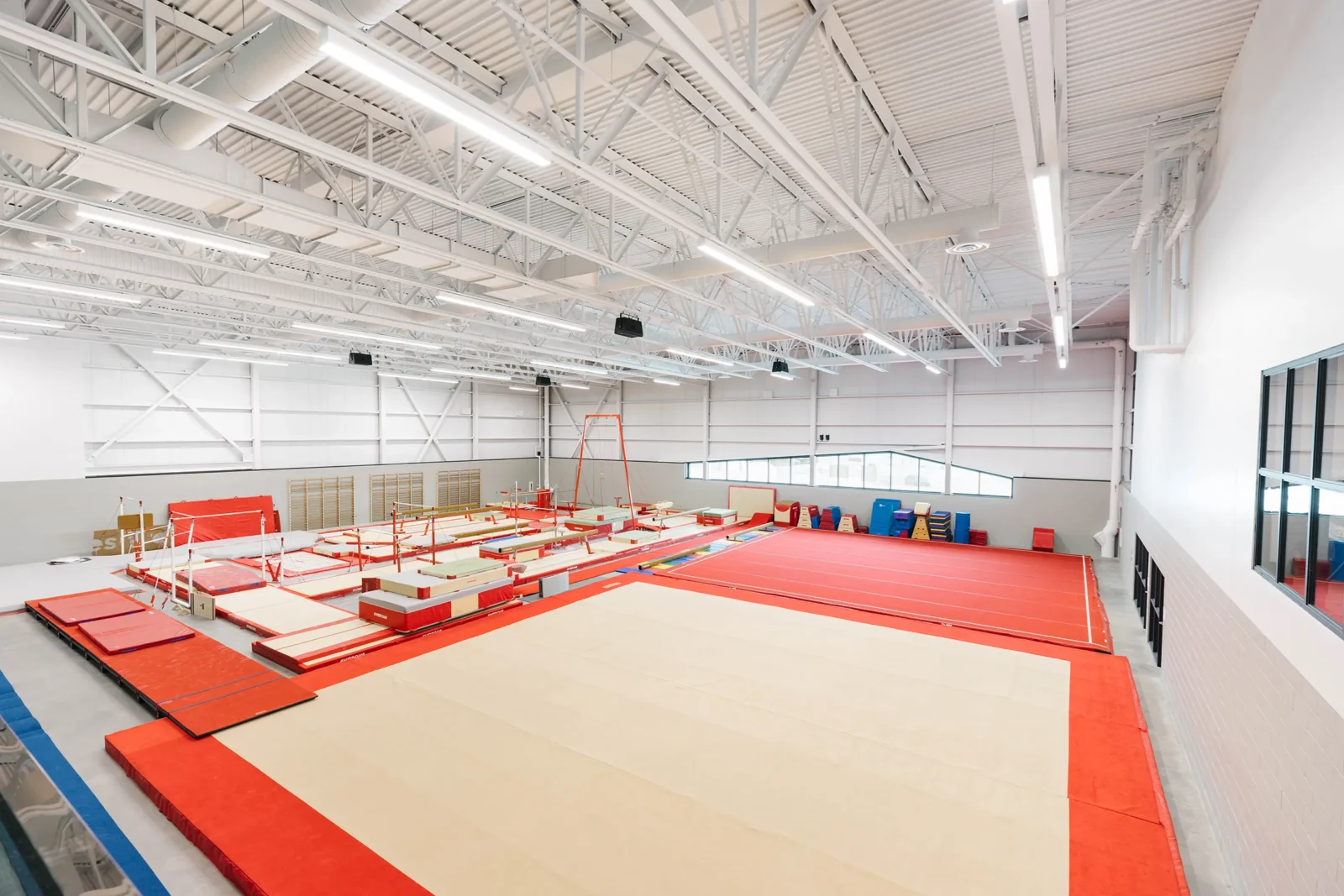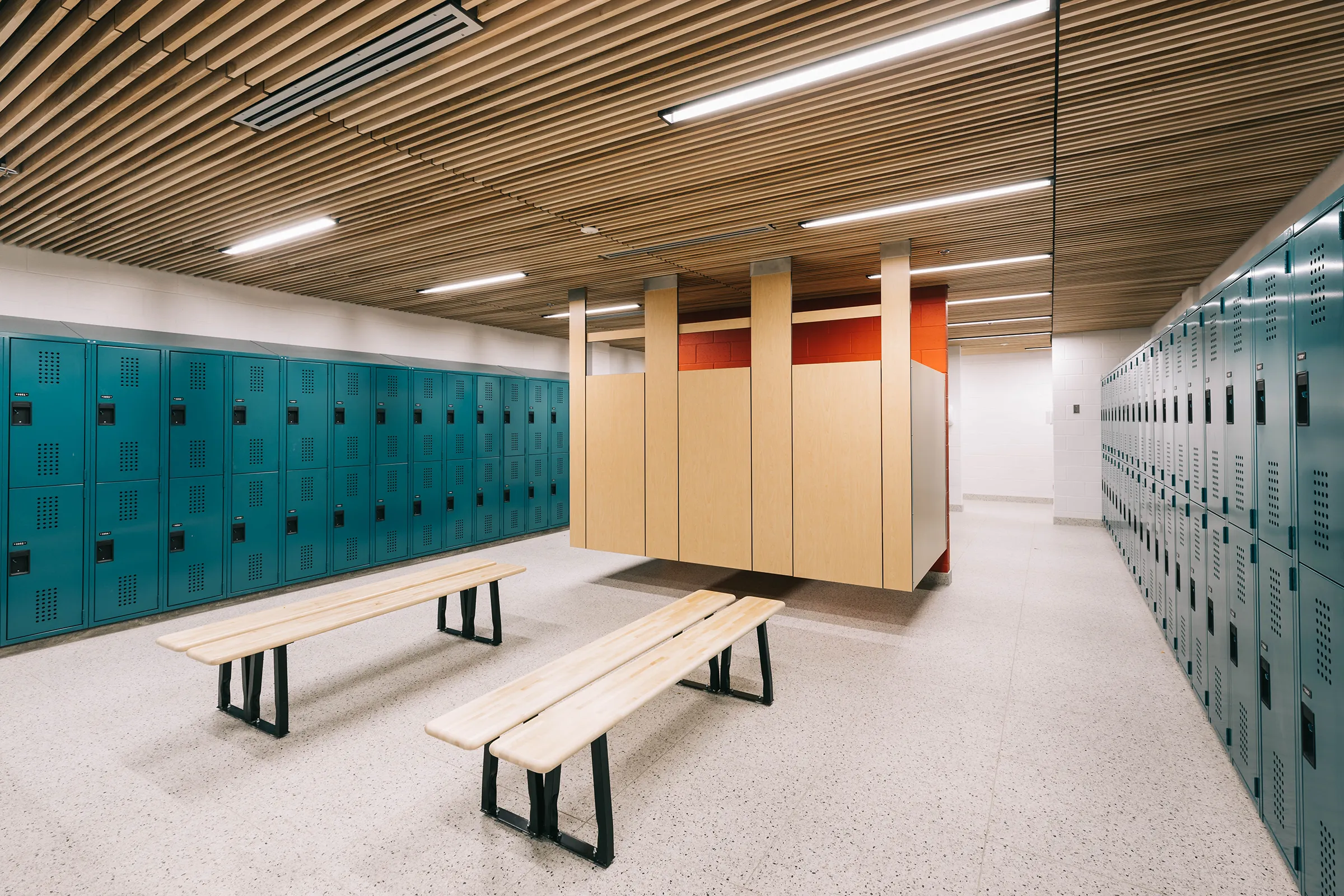 Ce bloc est traité de manière sobre et uniforme tout en présentant une façade latérale dynamisée par une percée vitrée dans l’enveloppe. Le second volume comprenant la palestre, présente un langage architectural plus défini en façade principale. La lumière naturelle pénètre de façon contrôlée à l’intérieur des plateaux.