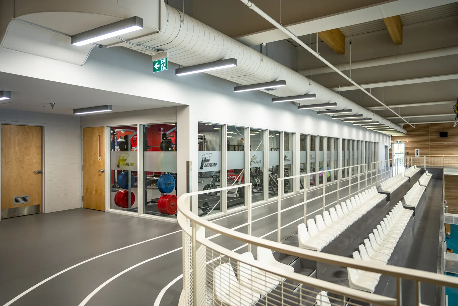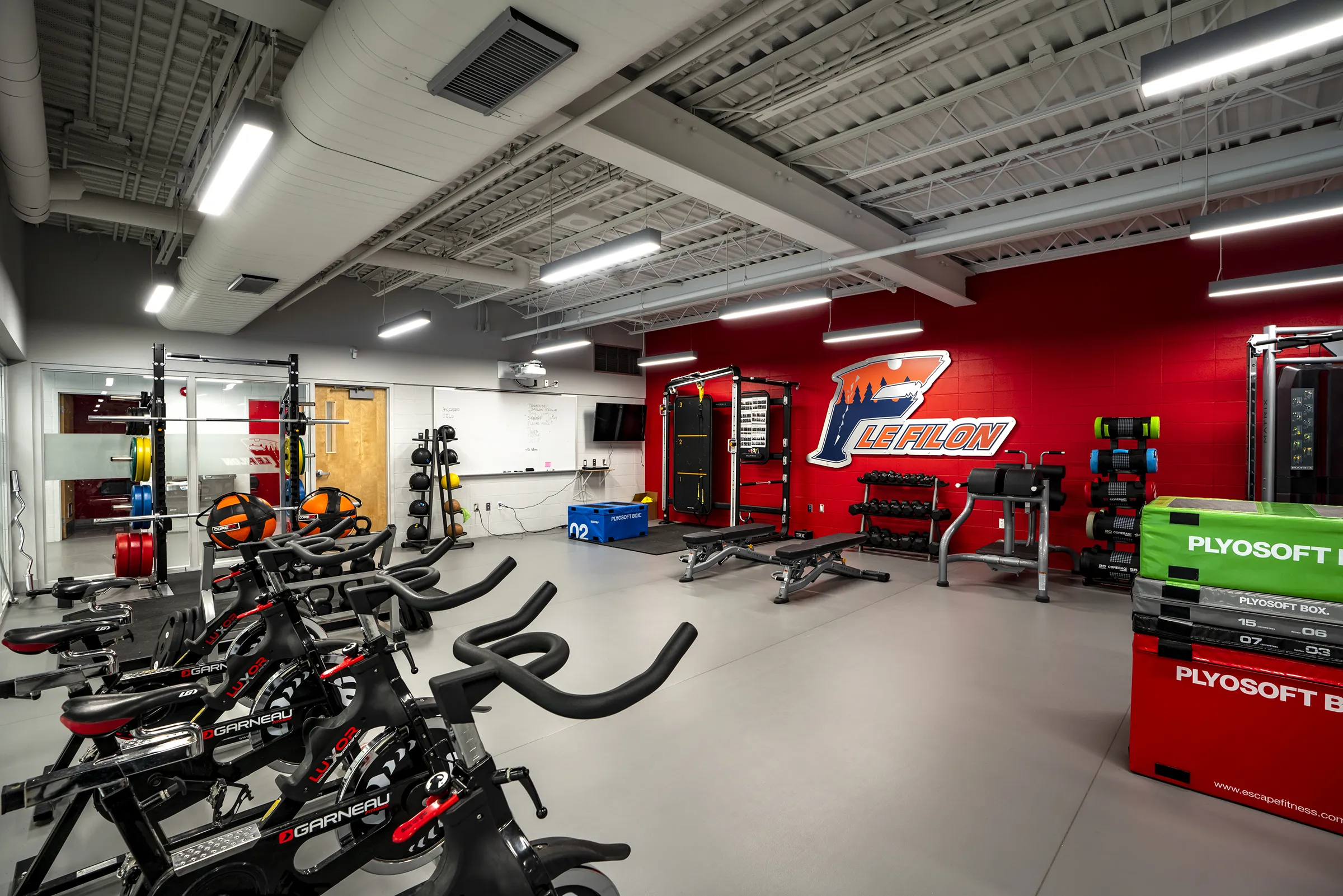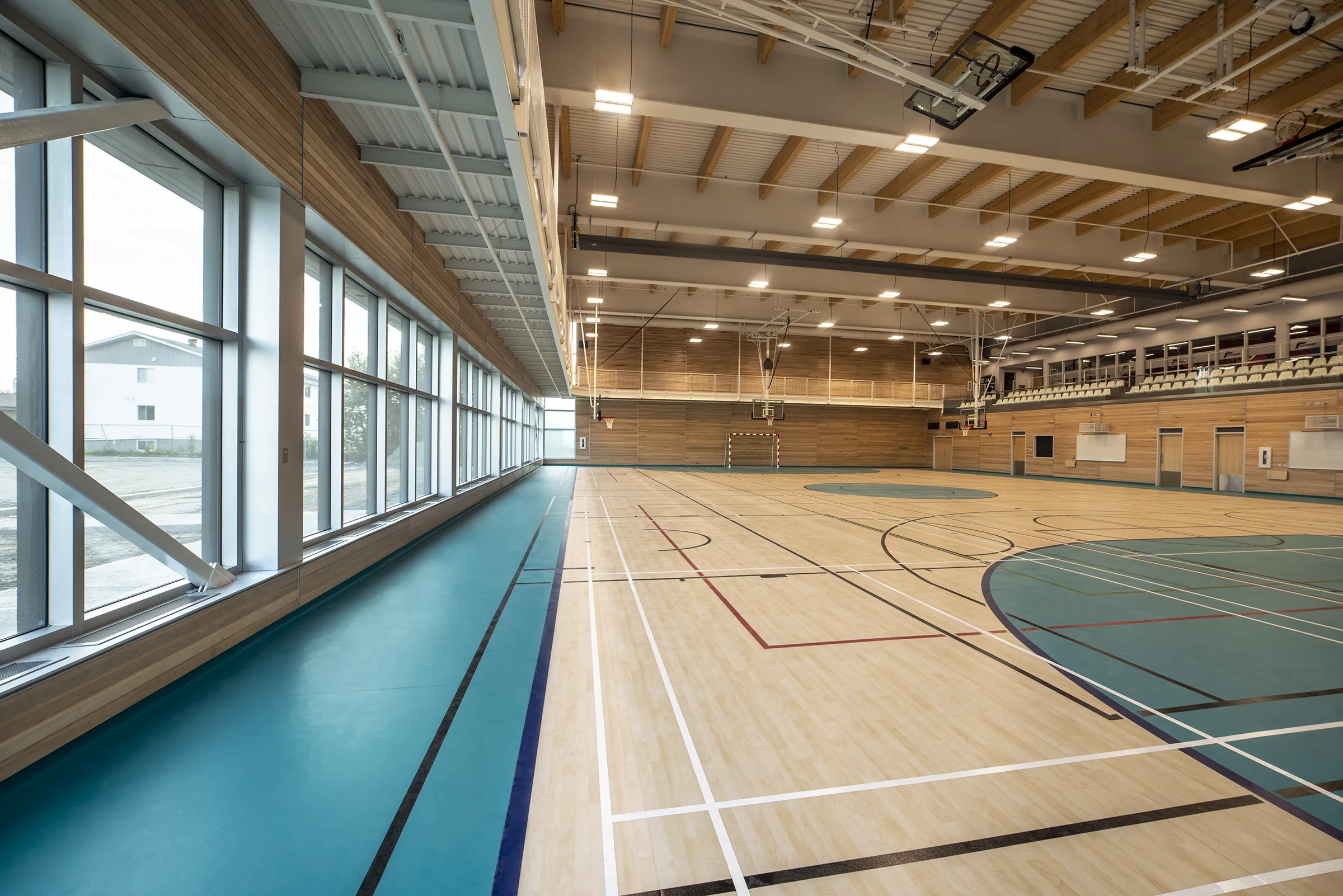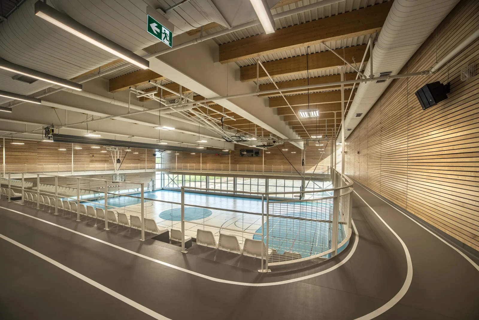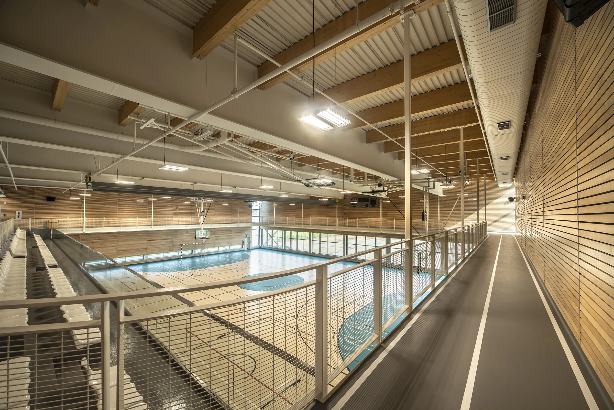 Pour le nouveau gymnase, les concepteurs ont considéré l’approche de la boîte éclatée. Le gymnase s’ouvre sur l’extérieur grâce à une fenestration généreuse du côté nord. L’éclatement du gymnase conventionnel, souvent trop clos et isolé, permet une relation avec l’extérieur et procure une luminosité naturelle intéressante pour les usagers.