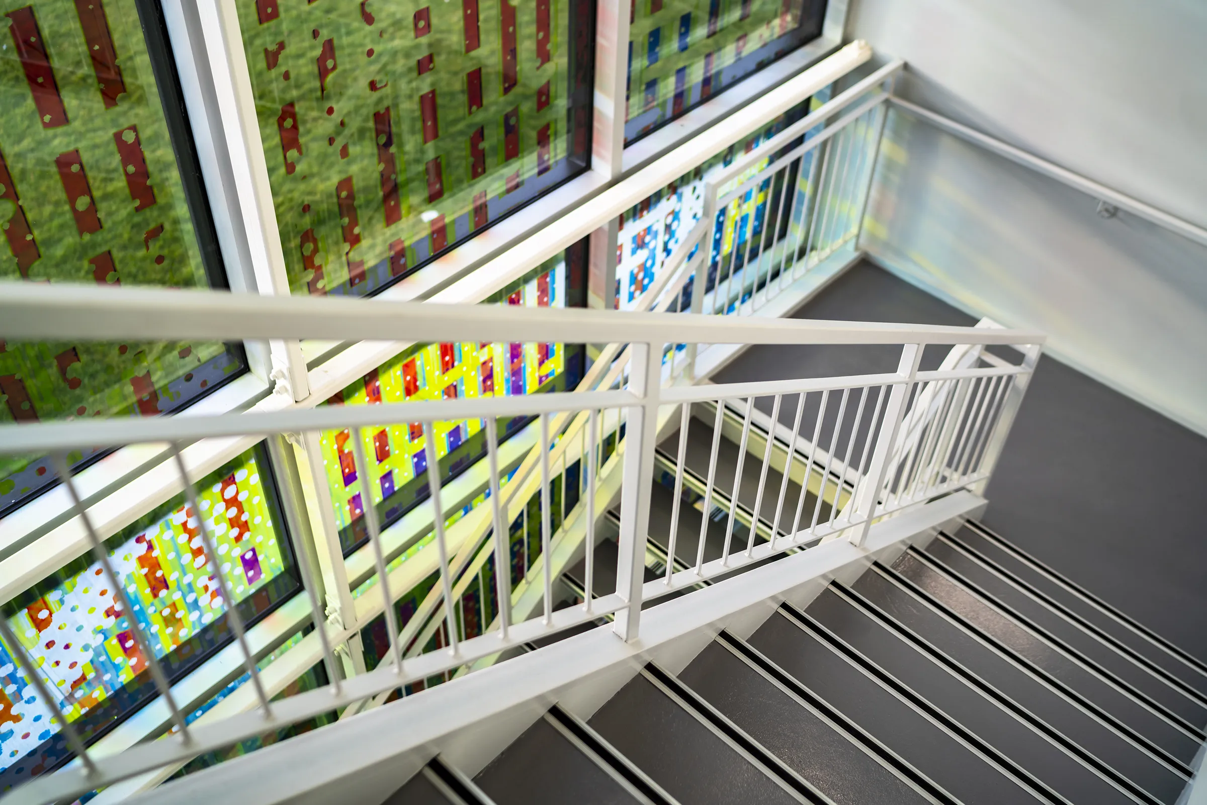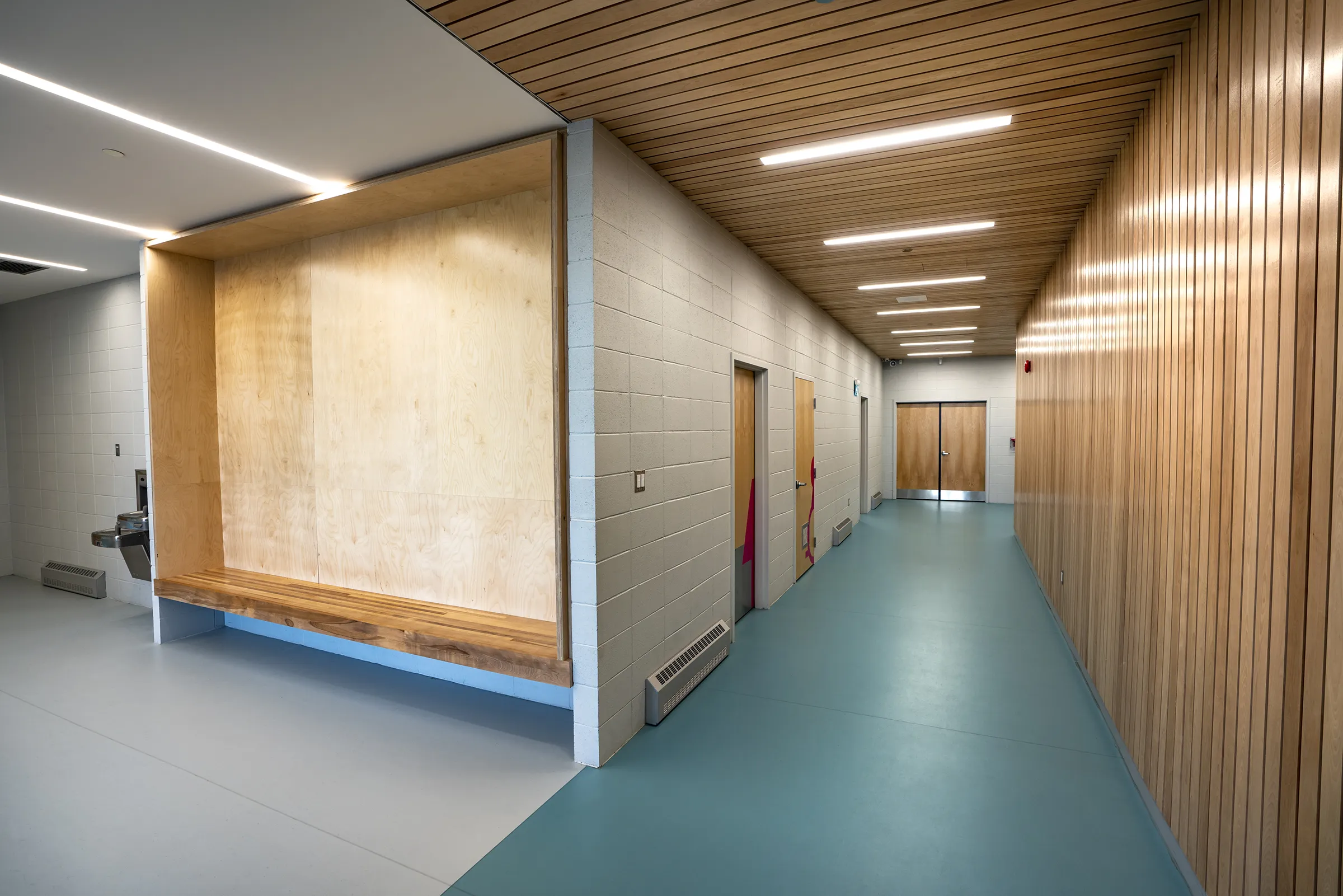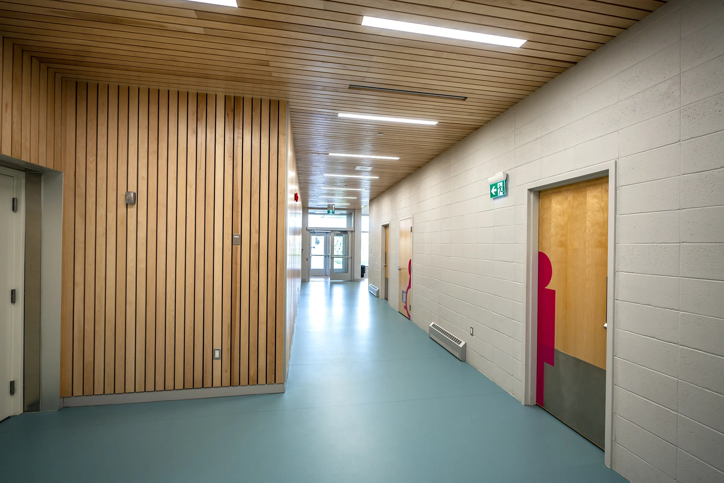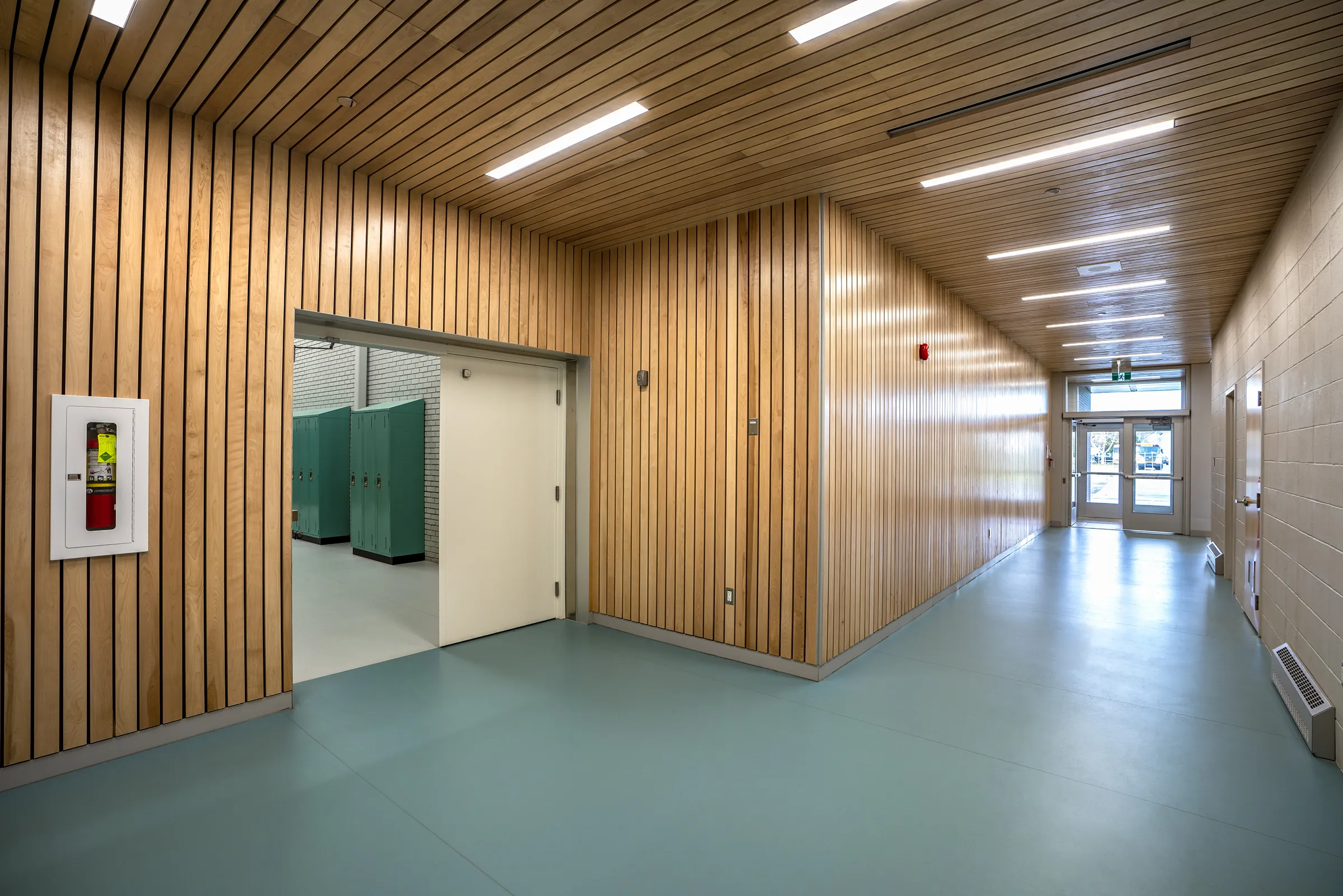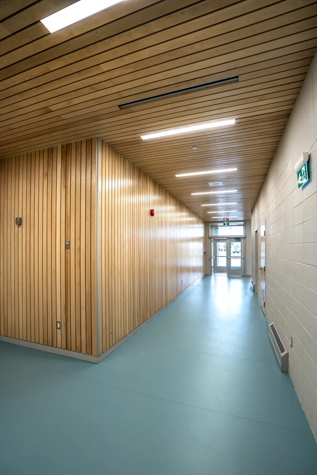 Pour le nouveau gymnase, les concepteurs ont considéré l’approche de la boîte éclatée. Le gymnase s’ouvre sur l’extérieur grâce à une fenestration généreuse du côté nord. L’éclatement du gymnase conventionnel, souvent trop clos et isolé, permet une relation avec l’extérieur et procure une luminosité naturelle intéressante pour les usagers.
